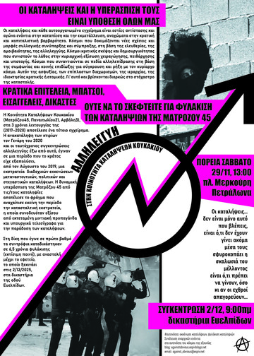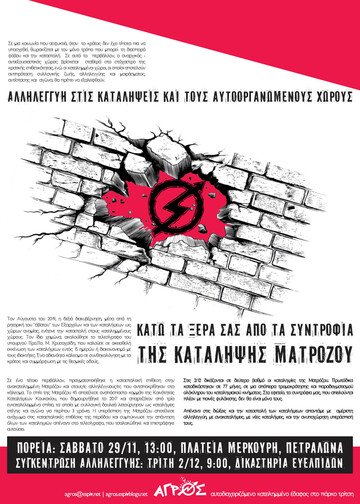 Στηρίζουμε την πορεία αλληλεγγύης στις (ανα)καταλήψεις | Σάββατο 29 Νοεμβρίου | 13:00 | πλ. Μερκούρη, Πετράλωνα