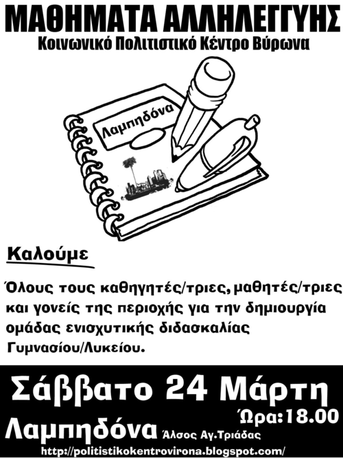 Όλους τους καθηγητές και τις καθηγήτριες, τους μαθητές και τις μαθήτριες αλλά και τους γονείς της περιοχής μας, το Σάββατο 24 Μαρτίου στις 6 μμ στη Λαμπηδόνα (άλσος Αγίας Τριάδας) για να συζητήσουμε και να δημιουργήσουμε ομάδα μαθημάτων αλληλεγγύης/κοινωνικού σχολείου που θα προσφέρει ενισχυτική διδασκαλία σε όσο το δυνατόν πιο πολλά μαθήματα.