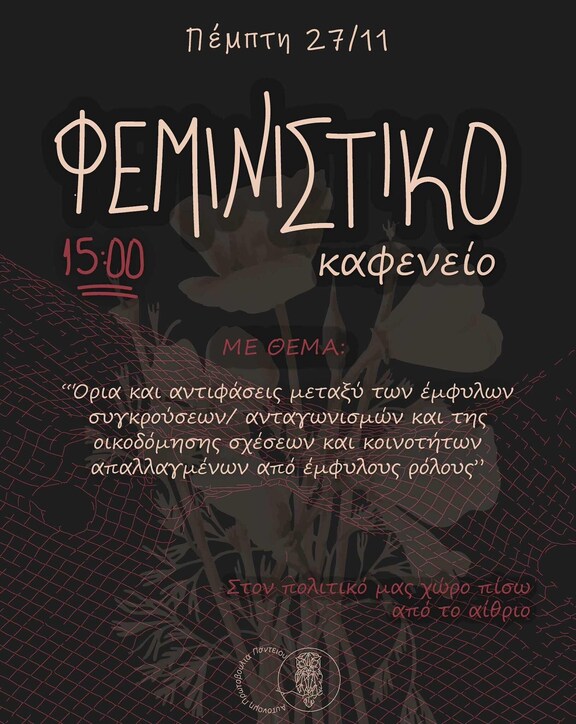 Σας περιμένουμε όλα και όλες (και όλους) αυτή την Πέμπτη 27/11 στις 15:00 στον πολιτικό μας χώρο πίσω από το αίθριο του Παντείου, στο φεμινιστικό καφενείο με θέμα: "Όρια και αντιφάσεις μεταξύ των έμφυλων συγκρούσεων και ανταγωνισμών και της οικοδόμησης σχέσεων και κοινοτήτων απαλλαγμένων από έμφυλους ρόλους".