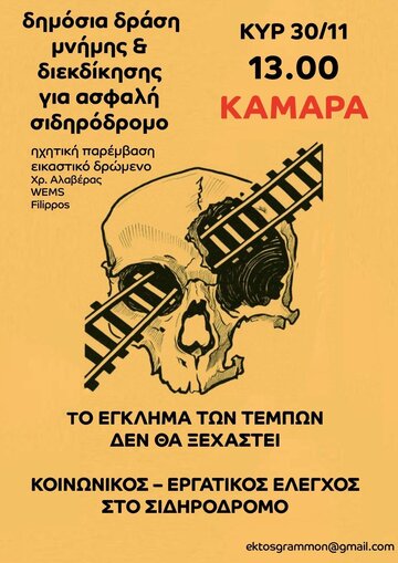 Καλούμε σε δημόσια δράση μνήμης και διεκδίκησης για ασφαλή σιδηρόδρομο την Κυριακή (30/11), 13:00 στην Καμάρα