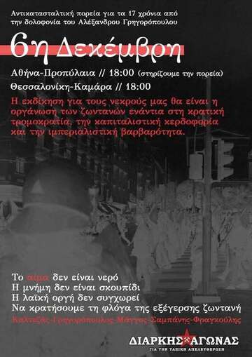 17 χρόνια συμπληρώνονται φέτος από την εν ψυχρώ δολοφονία του 15χρόνου αναρχικού μαθητή Αλέξανδρου Γρηγορόπουλου απο τον μπάτσο Κορκονέα στα Εξάρχεια. Τα γεγονότα της βραδιάς είναι γνωστά σε όλους/ες.