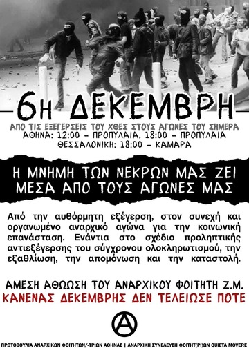 Το πρόσωπο του κράτους πάντα θα μας δείχνει τα δόντια του, κι εμείς θα είμαστε πάντα εδώ να αντιστεκόμαστε στις σχολές, στους χώρους δουλειάς και πάνω από όλα στις καταλήψεις, στον δρόμο και στα οδοφράγματα. Μέχρι το τέλος θα φωνάζουμε ΝΑ ΜΗΝ ΣΥΝΗΘΙΣΟΥΜΕ ΤΟΝ ΘΑΝΑΤΟ! Ο Δεκέμβρης του '08 και η λύσσα των εξεγερμένων έρχονται αφενός να αποτελέσουν ζωντανή μνήμη για εμάς, μιας νύχτας, μιας αρχής μιας εξέγερσης που κλόνισε τα θεμέλια της εξουσίας και δημιούργησε μια ρωγμή στον χρόνο. Αποτελεί αφετέρου μια σπίθα που πυροδοτεί τους δικούς μας αγώνες και που μας δείχνει πως ενάντια σε κράτος και θεσμούς του εμείς μπορούμε να ονειρευόμαστε και να "πλάθουμε ουτοπίες" ισότητας και αλληλεγγύης, ορθώνοντας οδοφράγματα και δρώντας αυτοοργανωμένα και συλλογικά. Κάθε Δεκέμβρης γίνεται όλο και πιο επίκαιρος και όσο θα σφίγγουμε τα χέρια με τους συντρόφους και τις συντρόφισσες μας θα ξέρουμε πως αυτή, όπως και κάθε εξέγερση θα είναι πάντοτε δίκαη.