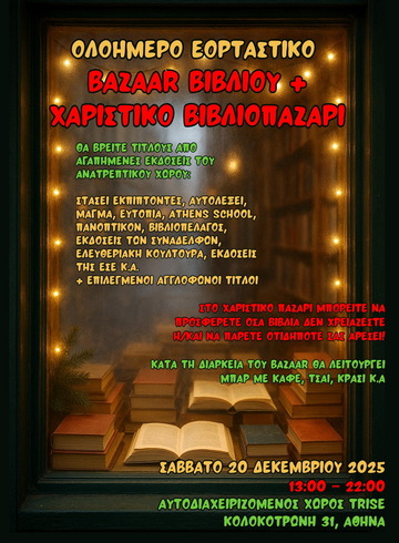 Με αφορμή την περίοδο που ανταλλάσσουμε δώρα, σας καλούμε και φέτος στο ολοήμερο εορταστικό μπαζάρ βιβλίου του TRISE με βιβλία πολιτικής σκέψης, φιλοσοφίας, λογοτεχνίας, επιστημονικής φαντασίας, ιστορίας, δοκίμια κ.ά.