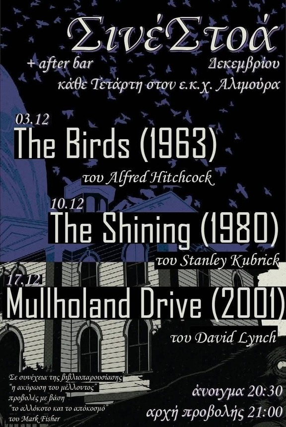 Η ΣινέΣτοά παρουσιάζει τον Δεκέμβριο, ένα αφιέρωμα βασισμένο στο βιβλίο "Το αλλόκοτο και το απόκοσμο" του Mark Fisher, σε συνέχεια της βιβλιοπαρουσίασης που είχε πραγματοποιηθεί στον Ε.Κ.Χ Αλιμούρα "η ακύρωση του μέλλοντος". Ατμοσφαιρικές και με τρόμο, οι τρεις ταινίες του Δεκεμβρίου, τις Τετάρτες στις 20:30, στην Αλιμούρα.