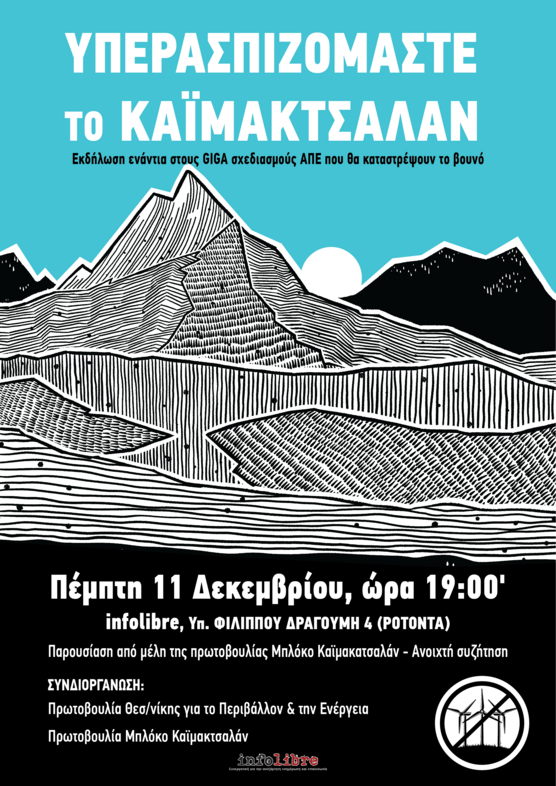 Σε αυτή τη συνθήκη, συντονιζόμαστε με την Πρωτοβουλία "Μπλόκο Καϊμακτσαλάν" από την Φλώρινα, που βρίσκεται στην πρώτη γραμμή ενάντια στη βίαιη και άναρχη εγκατάσταση ΑΠΕ. Άνθρωποι της περιοχής θα μεταφέρουν την πραγματική εικόνα της καταστροφής αλλά και της αντίστασης.