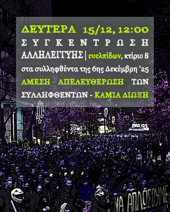 [Αθήνα] Συγκέντρωση αλληλεγγύης στους/ις συλληφθέντες/εισες της 6/12/25