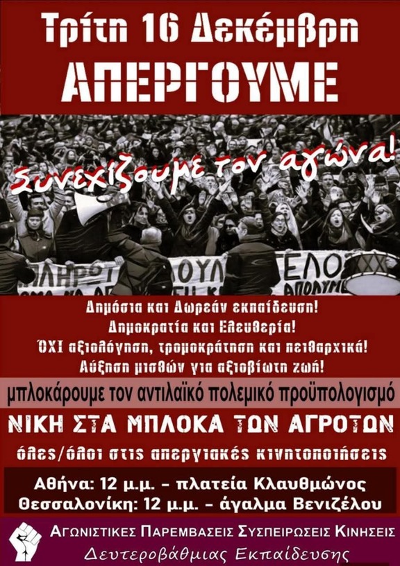 Η Ταξική Πορεία και οι Αγωνιστικές Κινήσεις Εκπαιδευτικών καλούν την Τρίτη 16 Δεκεμβρίου στις κινητοποιήσεις ενάντια στον αντιλαϊκό προϋπολογισμό του πολέμου και της εξαθλίωσης και υπέρ του δίκαιου αγώνα των φτωχομεσαίων αγροκτηνοτρόφων-παραγωγών.