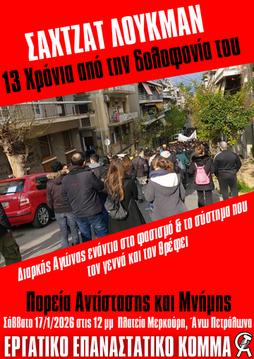 Στηρίζουμε τα καλέσματα το Σάββατο 17/01, στην Πλατεία Μερκούρη στις 12:00 στην αντιφασιστική πορεία για την δολοφονία του Σαχτζάτ Λουκμάν πριν απο 13 χρόνια στην περιοχή των Πετράλωνων.