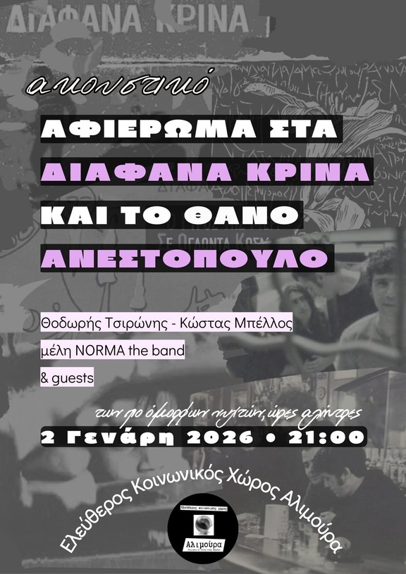 Την Παρασκευή 02/01, λοιπόν, ο Θοδωρής Τσιρώνης και ο Κώστας Μπέλλος - από τους αγαπημένους NORMA the band - μαζί με guest εμφανίσεις, θα μας ταξιδέψουν στη μουσική μιας εμβληματικής μπάντας της ελληνικής εναλλακτικής ροκ σκηνής. Αφιέρωμα στα Διάφανα Κρίνα και το Θάνο Ανεστόπουλο, για να μπει καλά το 2026.