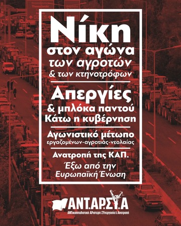Ο αγώνας των αγροτών πρέπει να ξεσηκώσει εργαζόμενους και νεολαία, για να επιβάλλουμε μια συντριπτική ήττα στην κυβέρνηση. Να απαιτήσουμε την κήρυξη Γενικής Απεργίας, να προχωρήσουμε σε διαδηλώσεις συμπαράστασης - ξεπερνώντας στην πράξη την αδράνεια και τις διασπαστικές κινήσεις της συνδικαλιστικής γραφειοκρατίας και της «αντιπολίτευσης» στη Βουλή. Να επιδείξουμε άμεσα αντανακλαστικά μπροστά στην πιθανή καταστολή του αγροτικού κινήματος, με μαζικές και μαχητικές κινητοποιήσεις στα μπλόκα και στις πόλεις. Η σκληρές συγκρούσεις των αγροτών στις Βρυξέλλες δείχνουν πως πρέπει να αντιμετωπίζουμε τις «κυβερνήσεις των πλουσίων» σε όλη την Ευρώπη. Μια ήττα της κυβέρνησης θα ενισχύσει όλους τους εργαζόμενους και νέους - Μια νίκη των αγροτών θα είναι νίκη όλων μας!