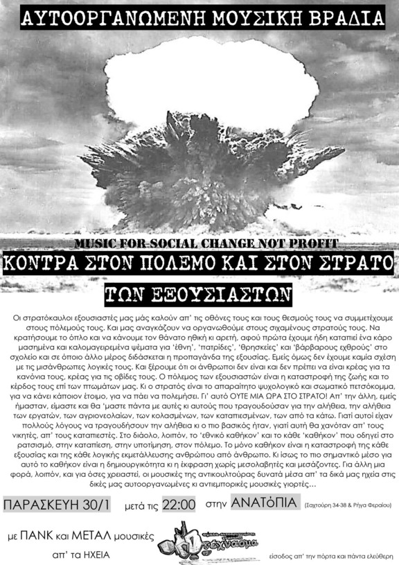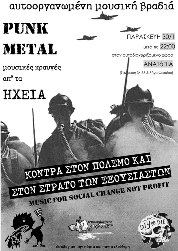 αυτοοργανωμένη πανκ και μέταλ μουσική βραδιά κόντρα στο στρατό και τον πόλεμο των εξουσιαστών…