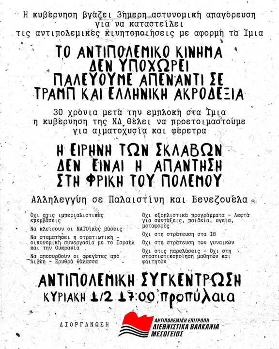 Δεν θα υποχωρήσουμε στην τρομοκρατία της κυβέρνησης! Δεν θα σιωπήσουμε απέναντι στα εγκλήματα που προετοιμάζει ο Τραμπ! Η αντιπολεμική συγκέντρωση και διαδήλωση θα πραγματοποιηθεί την ίδια μέρα και ώρα, Κυριακή 1 Φεβρουαρίου στις 5μμ στα Προπύλαια.