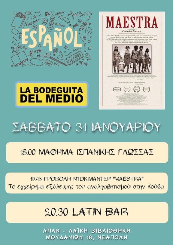 Αυτό το Σάββατο 31/01, μετά το μάθημα, θα γίνει η προβολή του ντοκιμαντέρ "Maestra" για το εγχείρημα εξάλειψης του αναλφαβητισμού στην Κούβα ενώ θα ακολουθήσει μπαρ με Latin ρυθμούς...