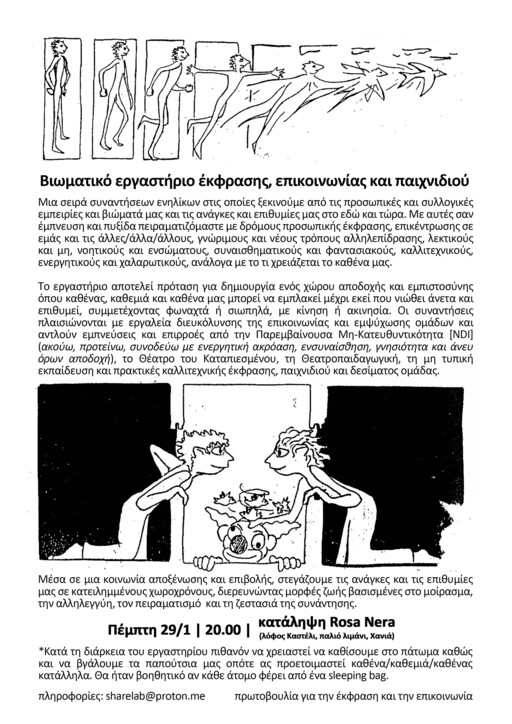 Μια σειρά συναντήσεων στις οποίες ξεκινούμε από τις προσωπικές και συλλογικές εμπειρίες και βιώματά μας και τις ανάγκες και επιθυμίες μας στο εδώ και τώρα. Με αυτές σαν έμπνευση και πυξίδα πειραματιζόμαστε με δρόμους προσωπικής έκφρασης, επικέντρωσης σε εμάς και τις άλλες/άλλα/άλλους, γνώριμους και νέους τρόπους αλληλεπίδρασης, λεκτικούς και μη, νοητικούς και ενσώματους, συναισθηματικούς και φαντασιακούς, καλλιτεχνικούς, ενεργητικούς και χαλαρωτικούς, ανάλογα με το τι χρειάζεται το καθένα μας.