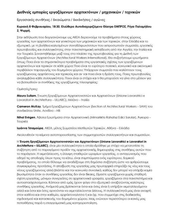 Διεθνείς εμπειρίες εργαζόμενων αρχιτεκτόνων / μηχανικών / τεχνικών - Εργασιακές συνθήκες / δικαιώματα / διεκδικήσεις / αγώνες