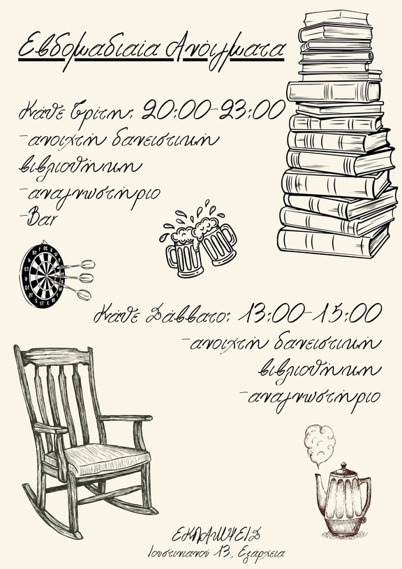 Κάθε Τρίτη 20.00-23.00 και κάθε Σάββατο 13.00-15.00, ανοιχτή βιβλιοθήκη, αναγνωστήριο, μπαρ και κουβέντα.