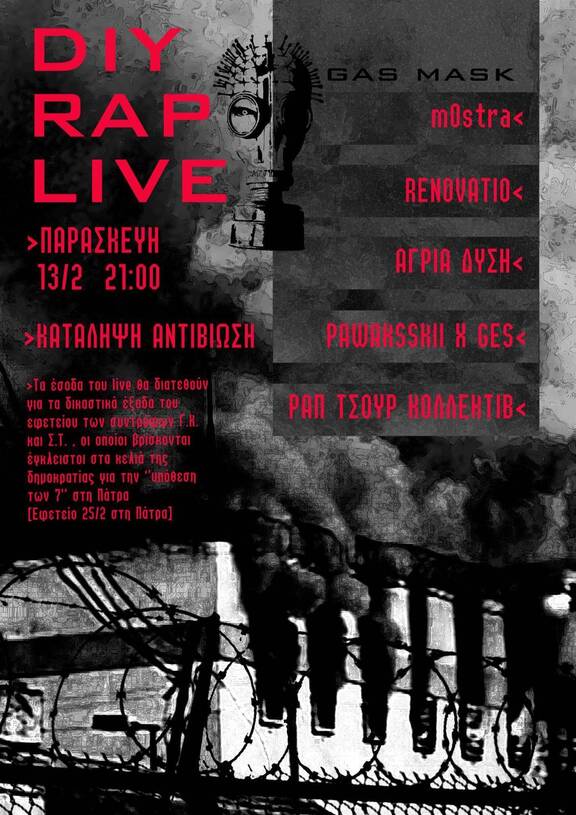 Τα έσοδα του live θα διατεθούν για τα δικαστικά έξοδα του εφετείου των συντρόφων Γ.Κ. και Σ.Τ. οι οποίοι βρίσκονται έγκλειστοι στα κελιά της δημοκρατίας για την "υπόθεση των 7" στην Πάτρα. [Εφετείο 25/2 στην Πάτρα]