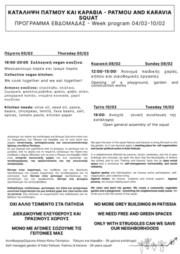 Ανοίγουμε την πόρτα της κατάληψης και δίνουμε ζωή στον κήπο των 2,1 στρεμμάτων της Πάτμου και Καραβία, για να γίνει ξανά ένα σημείο συνάντησης, αυτοοργάνωσης και κοινωνικοπολιτικής δράσης στα Κάτω Πατήσια.
