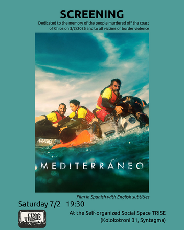 Η προβολή αυτή είναι αφιερωμένη στη μνήμη των ανθρώπων που δολοφονήθηκαν ανοιχτά της Χίου στις 3/2/2026, καθώς και σε όσα άτομα τραυματίστηκαν ή χάθηκαν στη θάλασσα. Αυτό που συνέβη δεν ήταν ατύχημα, αλλά το αποτέλεσμα μιας πολιτικής που μετατρέπει τα σύνορα σε μηχανισμό θανάτου.