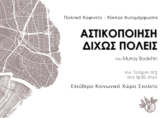 Ξεκινάμε με το βιβλίο που παρουσιάσαμε τον προηγούμενο μήνα, την «Αστικοποίηση δίχως πόλεις» σε μια προσπάθεια να μετακινηθούμε από μια πιο τυπική διαδικασία των βιβλιοπαρουσιάσεων όπου το κέντρο είναι οι εισηγητές σε μια πιο διαλογική και συμμετοχική διαδικασία όπως ένα καφενείο και μια αυτομόρφωση. Αν και προτρέπουμε την εκ των προτέρων ανάγνωση του βιβλίου ή μέρους του, αυτό δεν απαραίτητο για την συμμετοχή στο καφενείο, καθώς θα υπάρξει σύντομη εισήγηση παρουσίασης των ιδεών του βιβλίου για όσα άτομα δεν το έχουν διαβάσει με στόχο την ισότιμη συμμετοχή ώστε να ακολουθήσει ένας ελεύθερος και ανοιχτός διάλογος. Στο τέλος, θα υπάρξει μια σύντομη διαδικασία αναστοχασμού με στόχο την καλύτερη οργάνωση των επόμενων καφενείων.