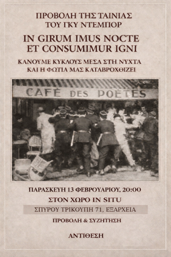 Προβολή της ταινίας του Γκυ Ντεμπόρ, In girum imus nocte et consumimur igni με εισαγωγή από το αντιεξουσιαστικό κομμουνιστικό εγχείρημα Αντίθεση.
