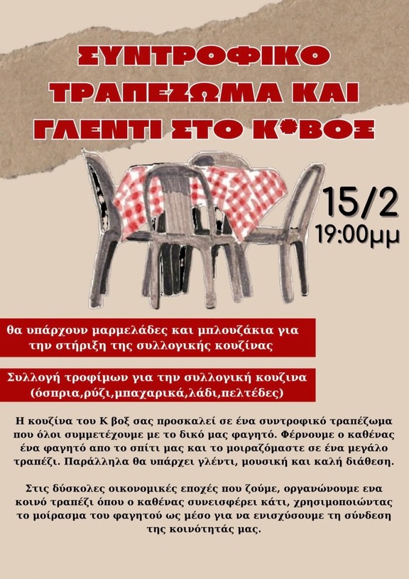 Η κουζίνα του Κ*ΒΟΞ σας προσκαλεί σε ένα συντροφικό τραπέζωμα που όλοι συμμετέχουμε με το δικό μας φαγητό. Φέρνουμε ο καθένας ένα φαγητό απο το σπίτι μας και το μοιραζόμαστε σε ένα μεγάλο τραπέζι. Παράλληλα θα υπάρχει γλέντι, μουσική και καλή διάθεση.