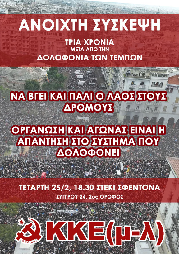 Ανοιχτή συζήτηση τρία χρόνια μετά τη δολοφονία των Τεμπών καλούμε όλο το λάο.