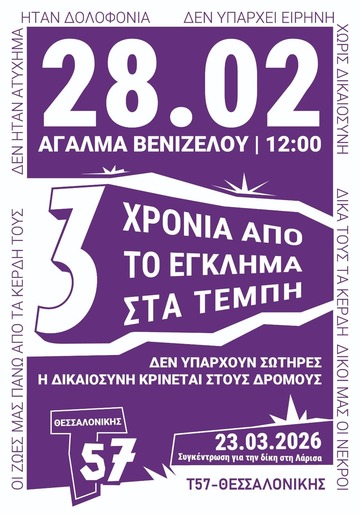 Για το κρατικό-καπιταλιστικό έγκλημα των Τεμπών έχουν χυθεί τόνοι μελάνης και αντίστοιχες μεγάλες ποσότητες από κροκοδείλια δάκρυα απ' την πλευρά της εξουσίας. Εδώ και τρία χρόνια προσπαθούν με λύσσα να συσκοτίσουν την αλήθεια. Προσπαθούν να γεμίσουν την δημόσια συζήτηση με ψέματα, με αμφιβολίες, με προσβολές προς τους συγγενείς των θυμάτων και τους τραυματίες επιζώντες. Το κράτος με το μπάζωμα και τη δικαστική συγκάλυψη από τη μία μεριά και τα ΜΜΕ με την σύγχυση και τη διασπορά συκοφαντιών από την άλλη, έχουν κάνει ότι μπορούν για να εξαφανίσουν την πραγματικότητα που πλέον όλες και όλοι μπορούν να δουν ξεκάθαρα: Το έγκλημα των Τεμπών δεν θα είχε συμβεί αν κράτος και ιδιωτικό κεφάλαιο, έδιναν έστω μια δεκάρα για τις ζωές των εργαζομένων και των επιβατών στα τρένα. Αν δεν είχε αναβληθεί η σύμβαση 717, αν υπήρχε μέριμνα για ασφαλή και πραγματικά δημόσια και προσβάσιμη μετακίνηση, αν δεν είχε γίνει (και) ο σιδηρόδρομος πεδίο ακραίας κερδοφορίας και μετακίνησης αγνώστων υλικών, αν δεν είχε γίνει πεδίο εξυπηρέτησης συμφερόντων ξένων από τα συμφέροντα της μεγάλης κοινωνικής πλειοψηφίας. Αν δεν υπήρχε αυτή η κοινωνική, οικονομική και πολιτική συνθήκη, τα 57 θύματα των Τεμπών θα ήταν ακόμη ζωντανά.