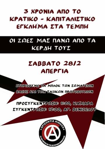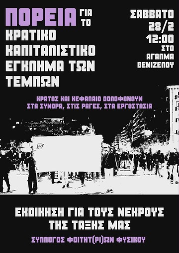 ΟΛΟΙ/ΕΣ ΣΤΗΝ ΑΠΕΡΓΙΑΚΗ ΠΟΡΕΙΑ ΓΙΑ ΤΟ ΚΡΑΤΙΚΟ ΚΑΠΙΤΑΛΙΣΤΙΚΟ ΕΓΚΛΗΜΑ ΤΩΝ ΤΕΜΠΩΝ - ΣΑΒΒΑΤΟ 28/2 12:00 ΣΤΟ ΑΓΑΛΜΑ ΒΕΝΙΖΕΛΟΥ