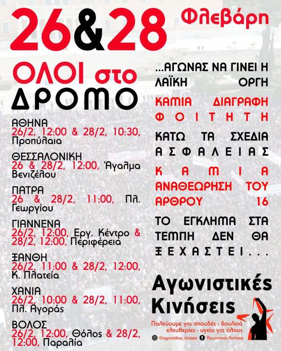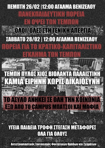 Τρία χρόνια μετά το κρατικό-καπιταλιστικό έγκλημα στα Τέμπη, όλοι οι λόγοι που μας έβγαλαν από την πρώτη στιγμή στους δρόμους παραμένουν ακόμα σε ισχύ: πολιτικά πρόσωπα δεν διώκονται, ο σιδηρόδρομος βρίσκεται ακόμα στην ίδια κατάσταση που οδήγησε στο έγκλημα της 28ης Φλεβάρη του 2023, ενώ σε όλο αυτό που διάστημα που μεσολάβησε μέχρι σήμερα η επίθεση Κράτους και Κεφαλαίου σε όλα τα κοινωνικά αγαθά (παιδεία, υγεία, στέγαση, μεταφορές) συνεχίζεται με αμείωτους ρυθμούς, κινούμενη στην ίδια κατεύθυνση, η οποία μπορεί να συνεχίσει να γεννάει μονάχα νέα εγκλήματα. Γιατί η ίδια επίθεση που αποσκοπεί στον έλεγχο και τη μεσολάβηση του Κράτους πάνω στα δημόσια αγαθά και τις κοινωνικές σχέσεις από τη μία, και στην κερδοφόρο εκμετάλλευση τους από το Κεφάλαιο από την άλλη, γεννιέται μέσα από την αθεράπευτα αντικοινωνική φύση του κρατικού-καπιταλιστικού συστήματος που ως μηχανισμός επιβίωσης και επιβολής σαν προτεραιότητα δεν μπορεί να έχει την κάλυψη των κοινωνικών αναγκών, αλλά την επιβίωση της παρασιτικής σχέσης των πολιτικών και οικονομικών ελίτ εις βάρος μας. Το ιστορικό βάθος του συγκεκριμένου εγκλήματος, από την μη ολοκλήρωση της σύμβασης 717 σε διάστημα εικοσαετίας με την εναλλαγή μιας σειράς κυβερνήσεων στην εξουσία, μέχρι το ξεπούλημα της ΤΡΑΙΝΟΣΕ σε Ιταλούς επενδυτές, επί της σοσιαλδημοκρατικής διακυβέρνησης ΣΥΡΙΖΑ, οι οποίοι επανέφεραν τρένα που είχαν αποσυρθεί για να τα λειτουργήσουν σε έναν εν γνώσει τους μη λειτουργικό σιδηρόδρομο, αποδεικνύει με τον πιο τραγικό τρόπο την πραγματικότητα αυτή.