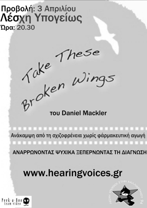 Σύμφωνα με την κυρίαρχη άποψη στο χώρο της ψυχικής υγείας η σχιζοφρένεια ορίζεται ως μια ανίατη χρόνια νόσος που η βάση της είναι βιολογική και γονιδιακά καθορισμένη. Μέσα από το πρίσμα αυτό, η φαρμακοθεραπεία αποτελεί μονόδρομο στην αντιμετώπιση της σχιζοφρένειας και πολύ συχνά ο ασθενής πρέπει να τη λαμβάνει εφόρου ζωής. Το ντοκιμαντέρ Take these broken wings του Daniel Mackler αποτελεί έναν αντίλογο στην προσέγγιση και αντιμετώπιση της σχιζοφρένειας με όρους ανίατης νόσου. Στο συγκεκριμένο φιλμ παρουσιάζονται οι ζωές δυο γυναικών οι οποίες ανάρρωσαν από τη σχιζοφρένεια, εστιάζοντας σε τραυματικές εμπειρίες που τους είχαν συμβεί στην παιδική ηλικία και είχαν καθορίσει τη μετέπειτα ζωή τους, και στην πορεία της προσωπικής τους ανάρρωσης.