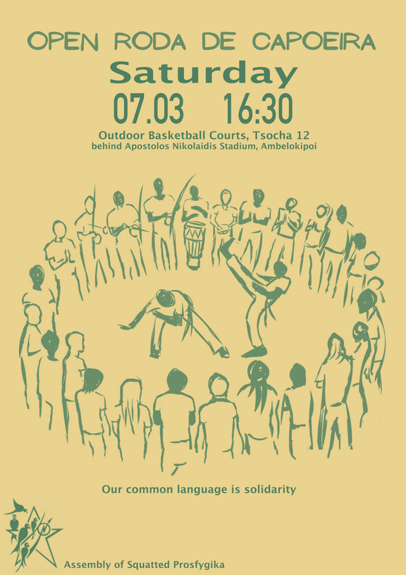 We will gather on Saturday, March 7, at 4:30 p.m. at the open basketball courts behind Alexandras Av. stadium (12 Tsocha Street, Ambelokipi), tune our instruments, and set up a Roda to support the Community of Squatted Prosfygika. Everyone is welcome!
