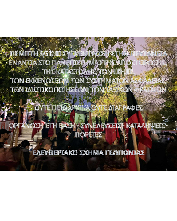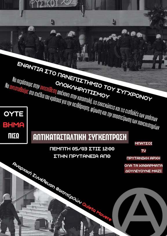 Το κράτος επιτίθεται ανοιχτά στον φοιτητικό κόσμο και ταυτόχρονα στην/στο αγωνιζόμενη/ο φοιτήτρια/η/ο θέλοντας να εξαφανίσει κάθε μορφή αντίστασης. Ολοφάνερη είναι η κορυφαία αύξηση της καταστολής μέσα στα πανεπιστήμια με βασικά παραδείγματα την εγκατάσταση τουρνικέ και καμερών στον χώρο των πανεπιστημίων (βλέπε ΕΚΠΑ, ΕΜΠ), την απρόσκοπτη εισβολή δυνάμεων καταστολής στο άσυλο και με πιο πρόσφατα παραδείγματα την απαγόρευση εισόδου στο ΑΠΘ και την διεξαγωγή δραστηριοτήτων πέραν των εκπαιδευτικών και ερευνητικών μετά τις 10 το βράδυ, δηλαδή την πλήρη αποστείρωση των πανεπιστημίων από πολιτική και πολιτισμική παρουσία. Αποκορύφωμα αυτής της βίαιης και αναίτιας επίθεσης αποτελούν τα γεγονότα στις 07/02 (313 βίαιες προσαγωγές λόγω πάρτυ στο ΑΠΘ) και αυτό στις 17/02, δηλαδή τη σύλληψη 38 ατόμων για προβολή ταινίας. Προφανώς, όλα αυτά τα κατασταλτικά γεγονότα δεν είναι ούτε τυχαία ούτε αποσπασματικά αλλά εντάσσονται σε μια χρόνια κρατική κατασταλτική στρατηγική με επίκεντρο το άσυλο (εκκένωση πρυτανείας '21, εγκατάσταση ΟΠΠΙ, απανωτές εκκενώσεις στεκιών, εκκένωση κατάληψης ΣΘΕ με 49 συλλήψεις στον αγώνα ενάντια στα ιδιωτικά πανεπιστήμια, 12 συλλήψεις στην παλιά φιλοσοφική για πτώση ασανσέρ στις εστίες, lock-outs, θέσπιση πειθαρχικών).