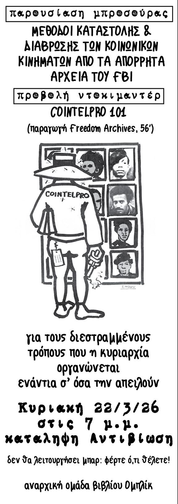 Η αναρχική ομάδα βιβλίου Ομπλίκ παρουσιάζει τη μπροσούρα "Μέθοδοι καταστολής και διάβρωσης των κινημάτων από τα απόρρητα αρχεία του FBI" και προβάλλει το ντοκιμαντέρ COIN.TEL.PRO 101.
