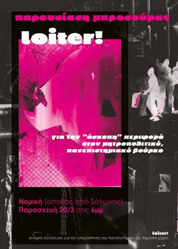 Παρασκευή 20/3/2026, 6μμ, Νομική | παρουσίαση μπροσούρας "loiter! για την άσκοπη περιφορά στον πανεπιστημιακό, μητροπολιτικό βούρκο"