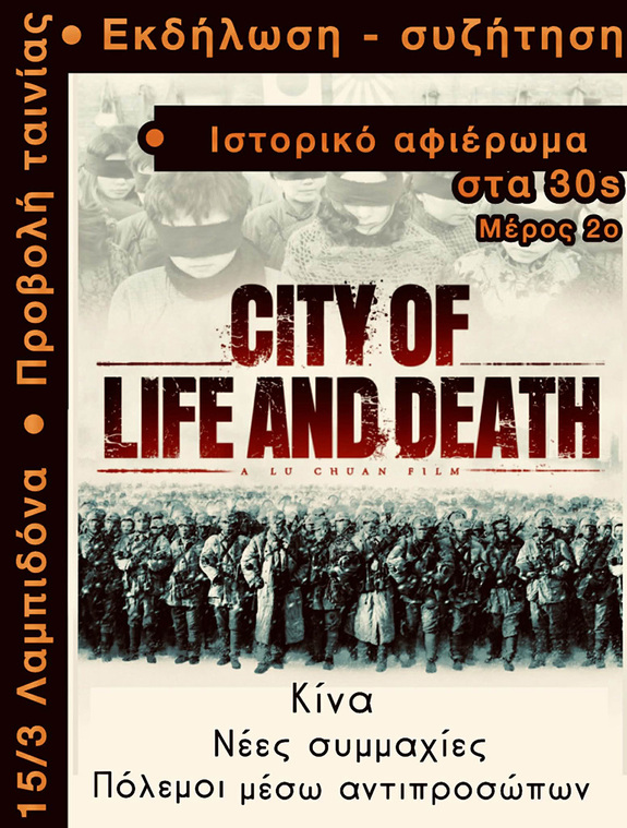 Θα ακολουθήσει προβολή της ταινίας "City of life and Death" (Η πόλη της ζωής και του θανάτου) σε σκηνοθεσία Chuan Lu, 2009 και ελεύθερη συζήτηση. Η ταινία αφηγείται τα γεγονότα που έλαβαν χώρα στην τότε πρωτεύουσα της Κίνας Ναντσίνγκ, κατά τη διάρκεια του 2ου Σινο-Ιαπωνικού πολέμου.