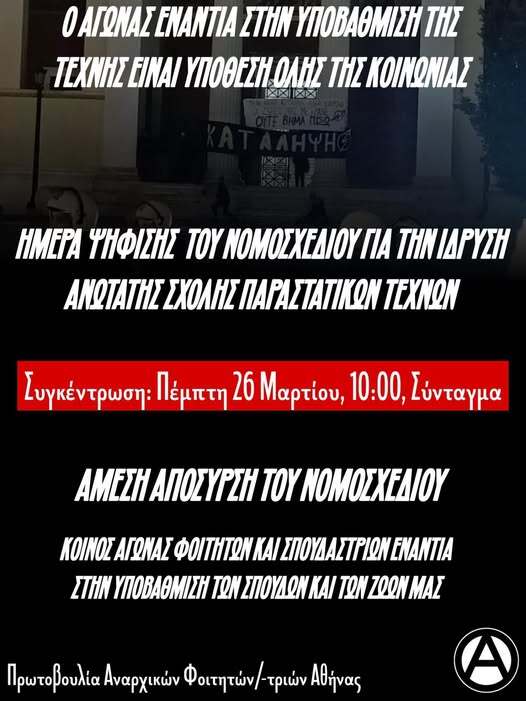 Ως αναρχικοί και αναρχικές, φοιτητές και σπουδάστριες, σταθήκαμε αλληλέγγυοι στον αγώνα ενάντια στο ΠΔ85, και προχωρήσαμε τότε στην κατάληψη της Πρυτανείας του ΕΚΠΑ στις 13 Μαρτίου 2023 με σκοπό τη δημιουργία ενός μαχητικού, αυτοοργανωμένου πόλου αντίστασης, ο οποίος θα στεκόταν, όπως και στάθηκε, πλάι στον κόσμο των καλλιτεχνικών και δραματικών σχολών, και στον κόσμο που εξέφραζε παράλληλα την οργή του για το Κρατικό-Καπιταλιστικό έγκλημα των Τεμπών. Έτσι και τώρα οφείλουμε να σταθούμε αλληλέγγυοι με τον αγώνα των καλλιτεχνών και με κοινό φοιτητικό-σπουδαστικό από τα κάτω αγώνα, να αντισταθούμε στα σχέδια Κράτους και Κεφαλαίου.