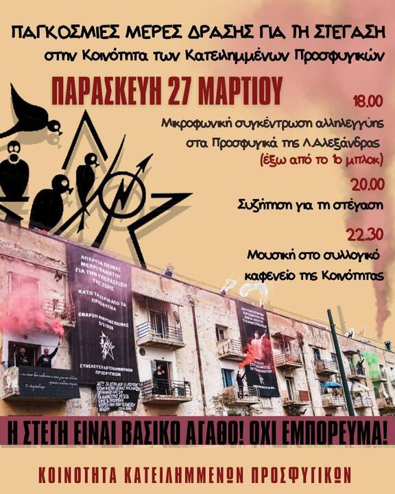 On Friday, March 27, at 18:00, we look forward to seeing you outside 1st Block of the Community of Squatted Prosfygika on Alexandras Avenue, where this year, as part of the international days of action for housing, collectives, unions, squats, networks, organizations, academics, and everyone affected by the housing crisis are joining their voices and showing their solidarity with the Community of Squatted Prosfygika.