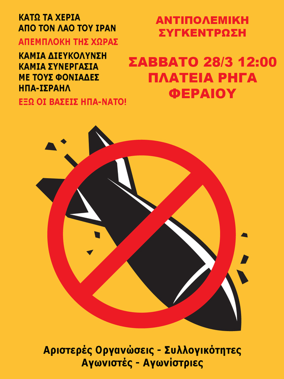 Το ΚΚΕ(μ-λ) από κοινού με άλλες οργανώσεις και συλλογικότητες καλεί σε αντιπολεμική συγκέντρωση στα Τρίκαλα το Σάββατο 28/3 στις 12:00 στην πλατεία Ρήγα Φεραίου.