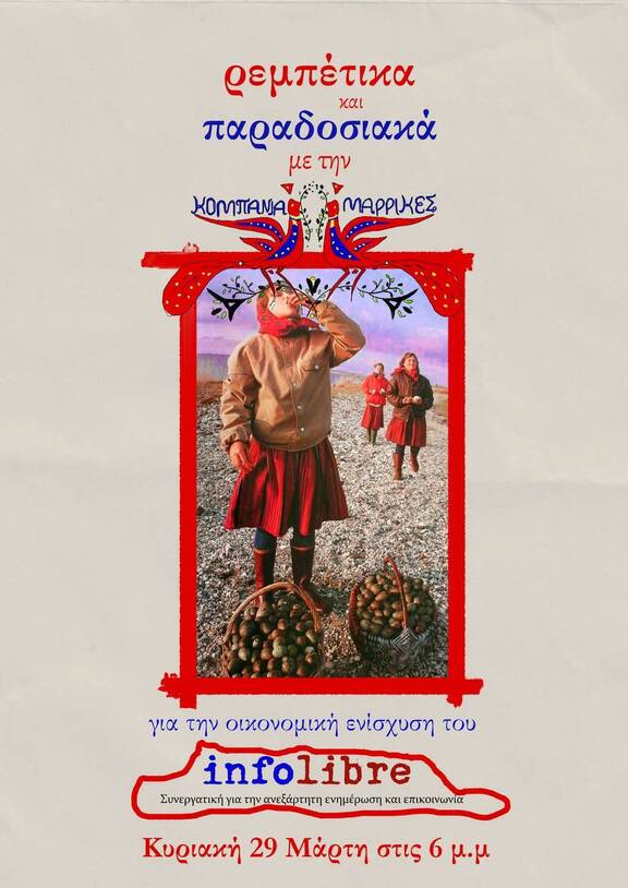 Τη Παρασκευή 29/3, στις 18:00, στον χώρο αυτοδιαχειριζόμενο χώρο του infolibre, η κομπανία "Μαρρίκες" παίζουν παραδοσιακά και ρεμπέτικα για την οικονομική ενίσχυση του χώρου.