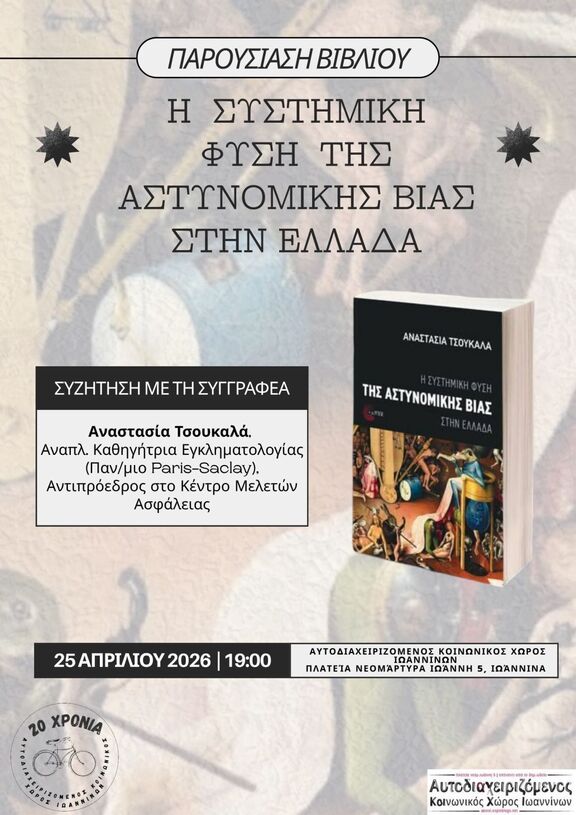 Στον Αυτοδιαχειριζόμενο Κοινωνικό Χώρο Ιωαννίνων (ΑΚΟΙΧΙ) θα έχουμε τη χαρά να συνομιλήσουμε με την Αναστασία Τσουκαλά, συγγραφέα του βιβλίου "Η συστημική φύση της αστυνομικής βίας στην Ελλάδα".