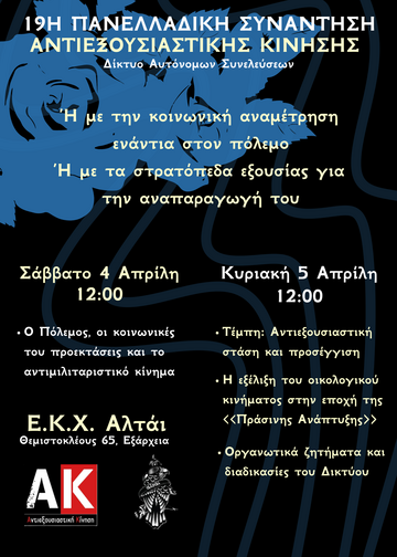 Με αφορμή τα παραπάνω, συναντιόμαστε και συζητάμε, στην 19η πανελλαδική συνάντηση του δικτύου αυτόνομων συνελεύσεων της Αντιεξουσιαστικής Κίνησης, για τη στάση μας απέναντι στον πόλεμο και την ανάγκη δημιουργίας ενός ευρύτερου αντιμιλιταριστικού κινήματος για να σταματήσουμε την τροχιά του θανάτου. Ενός κινήματος που θα εντάσσει τον αγώνα για την ήττα του ιμπεριαλισμού και των σχέσεων κυριαρχίας στην προοπτική της χειραφέτησης.