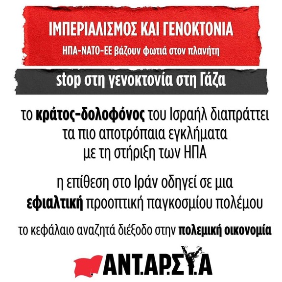 Απαιτούμε το σταμάτημα κάθε συνεργασίας, στρατιωτικής, οικονομική και πολιτικής στον πόλεμο Τραμπ - Νετανιάχου ενάντια σε ΙΡΑΝ -ΛΙΒΑΝΟ-ΠΑΛΑΙΣΤΙΝΗ. Θέλουμε λεφτά για Υγεία και Παιδεία και όχι για εξοπλισμούς. Να κλείσουν οι βάσεις, έξω το ΝΑΤΟ, να τσακίσουμε τον αντιδραστικό άξονα Ελλάδας - Κύπρου - Ισραήλ - Αιγύπτου.
