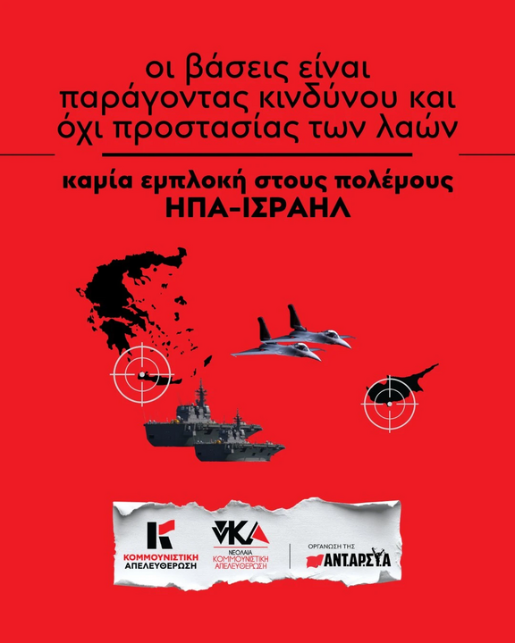 Η κυβέρνηση της ΝΔ με την ουσιαστική στήριξη της συμπολιτευόμενης «αντιπολίτευσης», έχει παραχωρήσει την χώρα στους αμερικάνους και ισραηλινούς φονιάδες. Την έχει μετατρέψει σε μια απέραντη αμερικανονατοϊκή βάση, σε ορμητήριο πολέμου και ταυτόχρονα σε στόχο αντιποίνων. Στέλνει φρεγάτες και F-16 στην Κύπρο για να προστατεύσει την βρετανική βάση, με τους Patriot στην Σαουδική Αραβία στηρίζει την επίθεση ενάντια στο Ιράν.