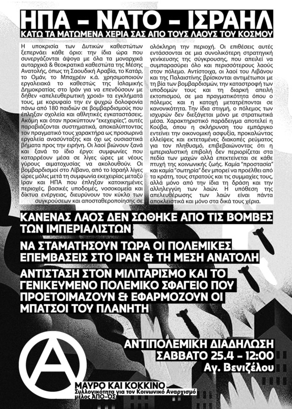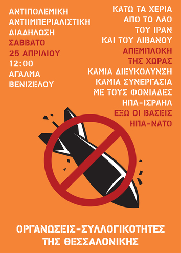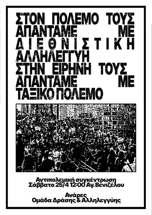 ΟΛΟΙ ΚΑΙ ΟΛΕΣ στην ΑΝΤΙΠΟΛΕΜΙΚΗ- ΑΝΤΙΪΜΠΕΡΙΑΛΙΣΤΙΚΗ ΣΥΓΚΕΝΤΡΩΣΗ - ΔΙΑΔΗΛΩΣΗ το Σάββατο 25 Απριλίου στις 12 το μεσημέρι, στο Άγαλμα Βενιζέλου