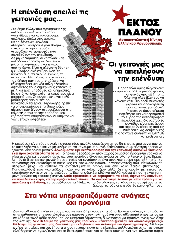Είναι ανάγκη να πάρουμε όλες και όλοι θέση ενάντια στο έγκλημα που διαπράττουν εις βάρος των ζωών και των γειτονιών μας κράτος-επενδυτές.Σε συνεργασία φυσικά με τη δημοτική αρχή Ελληνικού Αργυρούπολης που από την πρώτη μέρα που μπήκε σε εφαρμογή το σχέδιο της ΛΕΗΛΑΣΙΑΣ των προαστίων μας βρίσκεται σε αγαστή συνεργασία με τη LAMDA και τις κυβερνήσεις