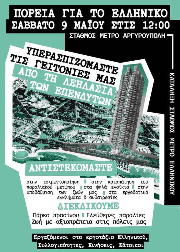 Καλούμε έτσι το ΣΑΒΒΑΤΟ 9/5 στις 12:00 όλες και όλους σε μια μαζική διαδήλωση που θα στείλει το αναγκαίο μήνυμα αγώνα ενάντια στην επένδυση στο Ελληνικό