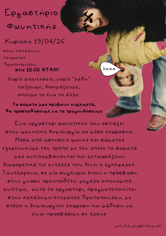 Σας προσκαλούμε στο επισήμως μηνιαίο εργαστήριο φωνητικής την Κυριακή 19 Απριλίου στην κατάληψη κτήματος Πραποπούλου στις 15:00 ΝΤΑΝ!