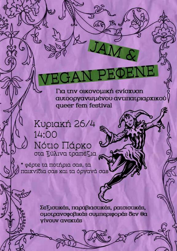 Επιλέξαμε να κάνουμε το ρεφένε & jam οικονομικής ενίσχυσης του Wysteria Fest στο νότιο πάρκο, καθώς έχουμε ανάγκη για επαφή με τη φύση και τη διεκδίκηση δημόσιων χώρων που θα μπορούμε να γνωριστούμε, να φάμε βίγκαν φαγητά, να ακούσουμε μουσική, να ξεχαστούμε και να παίξουμε με τους δικούς μας όρους.