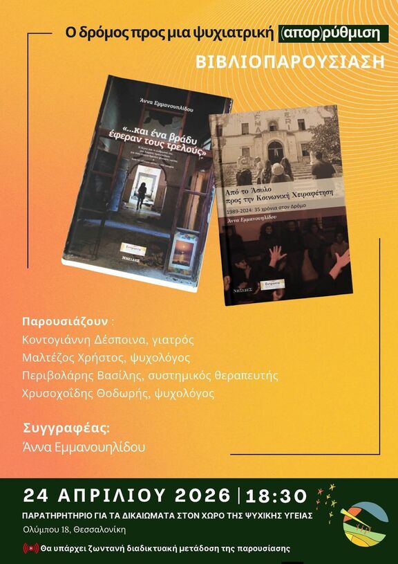 Τα βιβλία που θα παρουσιαστούν φέρουν τους τίτλους "Κι ένα βράδυ έφεραν τους τρελούς" & "Από το Άσυλο, προς την Κοινωνική Χειραφέτηση".